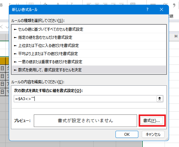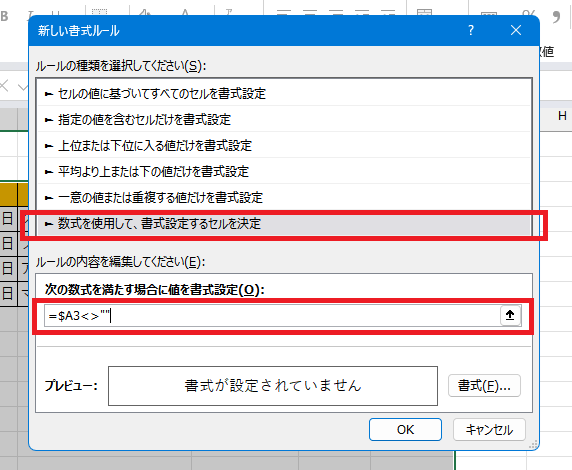 3.「数式を使用して、初期設定するセルを決定」を選び、下の数式入力個所に「=$A3<>””」と入力する。この時のセル番号は選択した範囲の一番左上のセル番号を入力すること。