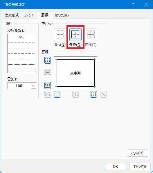 5.罫線の「外枠」を選択してOKボタンをクリック。前ダイアログボックスについてもOKボタンをクリックして設定を終了する。