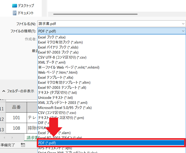 PDFファイルに変換するには、「名前を付けて保存」の際に「ファイルの種類」のリストから【PDF】を選択し保存するというのが一般的です。