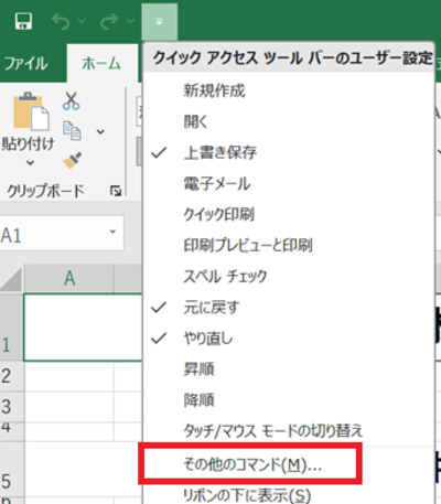 クイックアクセスツールバーの▼ボタンでリストを展開し、【その他のコマンド】を選択します。