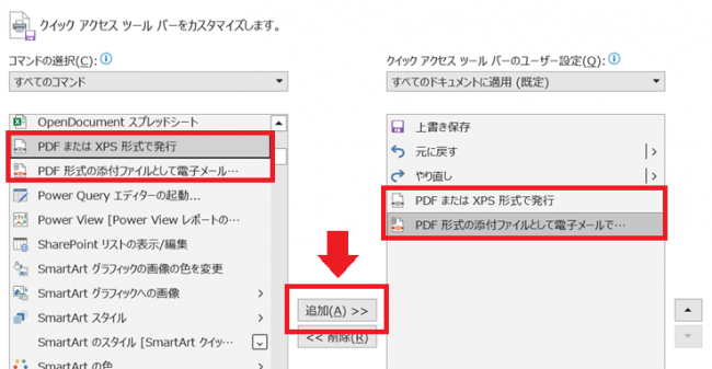 【コマンドの選択】から【PDFまたはXPS形式で発行】もしくは【PDF形式の添付ファイルとして電子メールで送信する】コマンドを選択したまま、真ん中の【追加】ボタンをクリックし、【クイックアクセスツールバーのユーザー設定】に追加されることを確認します。