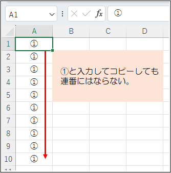 Excelで例えば縦方向に①から⑩までの連番を作成したいとき、①と入力してからコピーをしても下の図のように①が複製されるだけで連番にはなりません。