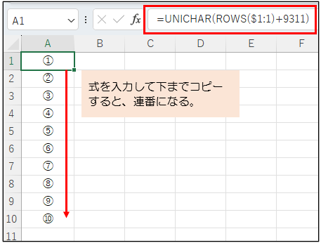 仮に1行目から10行目までに①~⑩の連番を作成したいときは、1行目に次のような式を入力します。