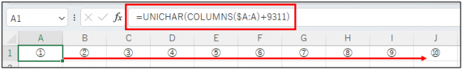 → 「ROWS($1:1)」で1という値が返されますので、上の関数は「UNICHAR(1+9311)」、つまり「UNICHAR(9312)」を表すこととなり、Unicode番号の①が返されることになるわけです。